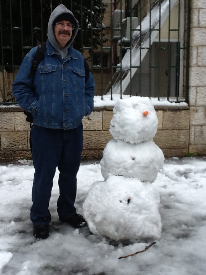 As you can tell, however, I have also become obsessed with Israel’s weather. It has kept us indoors far too often this past week, and today was no exception. EVERYTHING in Jerusalem shut down. My UJA teaching gig was cancelled yesterday in anticipation of the snow (though rescheduled for Sunday), schools were closed, and when we got up this morning thinking we would spend the day at the Israel Museum, we found the walkways far too treacherous (no one has shovels  — and Jerusalem stone, out of which many sidewalks — and buildings — are made, is quite slick). We tried walking in the middle of the road, but even that was just too slippery.  We would have compromised on our “walk everywhere we can” rule, but found that no busses or cabs were running, there being no snowplows to clear the roads! I imagine that few people got to work. Though we were able to buy a newspaper and shop at the local market, most stores (and even the post office) were closed. For those of us who live in the northeast, the idea of a whole city shutting down in the face of a few inches of snow is humorous.