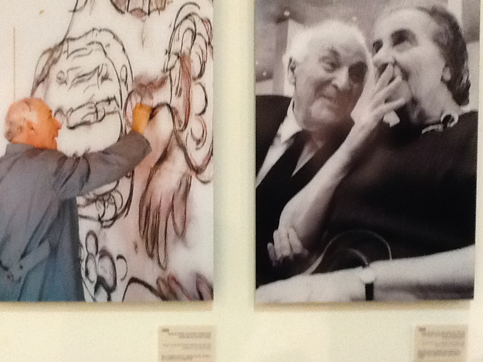 The Chagall tapestries representing Jewish history past, present, and future hang in the Knesset’s State Hall. I am not posting a photo of the tapestries (I’ll send photos with commentary if you ask), but rather a photo of Chagall at work on the sketches and one of Golda Meir with Chagall when the tapestries were first hung in 1969. Chagall apparently leaned over to her and said in Yiddish, “Do you like it, Golda?” It looks like she did! (These photos were part of a rotating exhibit of photographs in the Knesset by the official Knesset photographer David Rubinger.)