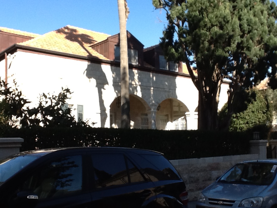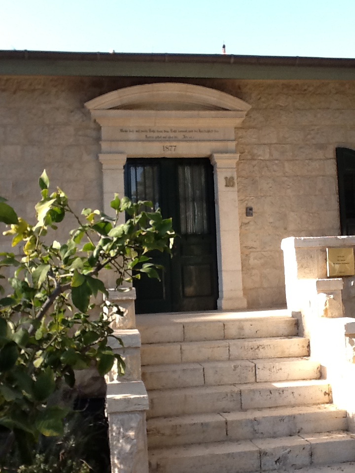 Based on one of the walks we found in Footloose in Jerusalem, our walk took us past the following places: the Sholom Hartman Institute, the old Hansen Leper Hospital, the Van Leer Foundation, The Israel Academy of Arts and Sciences (Israel’s “brain trust”), the President’s residence (the president is not the same position as the prime minister, BTW), the Jerusalem Theater (where the Begin-Sadat press conference took place in 1977), the Museum of Islamic Art, the spot where Folke Bernadotte was assassinated (he’s the Swede who Bili’s husband Mats is researching), philosopher Martin Buber’s home, homes with beautiful iron grillwork, typically done by Arab craftsmen, a rose garden, and a lot of Templer buildings. The Templers were members of a German Protestant sect who believed that living in the Holy Land would hasten the second coming of Christ. They gave the name to the German Colony of Jerusalem, the trendy neighborhood where I lived during rabbinical school and next door to the Greek Colony where Chaim and I are currently staying.