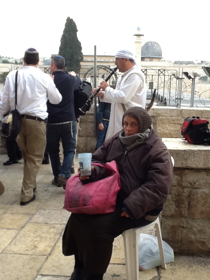 Here is a picture of one of today’s Soras with her outstretched cup. Behind her a bar mitzvah celebration is taking place with some klezmer musicians. The Wall is just down and off to the left.