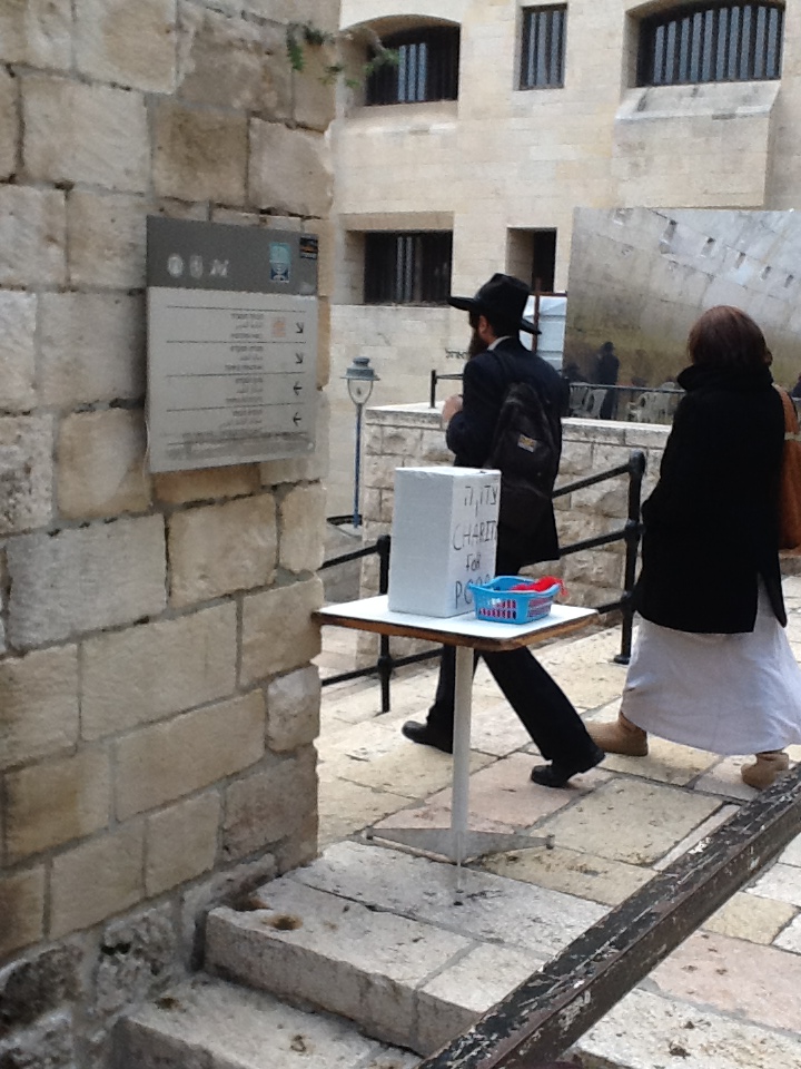 In the Old City, some tzedakah boxes stand independently of a human being. Here is one on a table on one’s path down to the Wall that also has a “payback” for a donation — a box filled with red strings. To wear a red string around one’s wrist as a talisman is supposed to ward off the evil eye. At least that’s what Madonna and the Kabbalah Center seem to think.