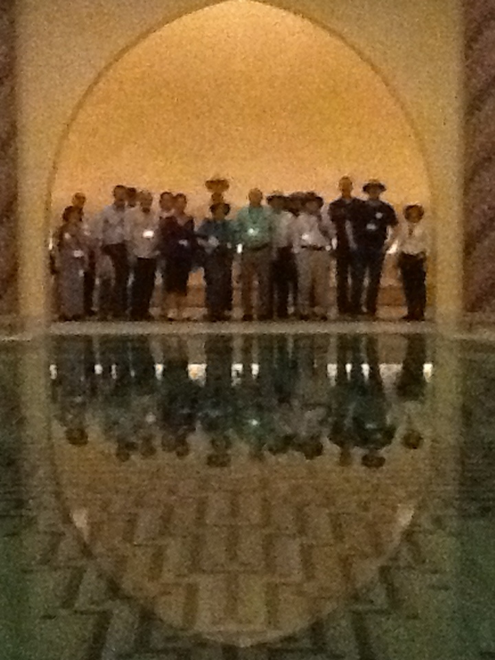 Downstairs were all of these fountains for pre-prayer ablutions, as well as a chamam bath. Our guide got a terrific shot of us on the other side with a reflection in the pool.