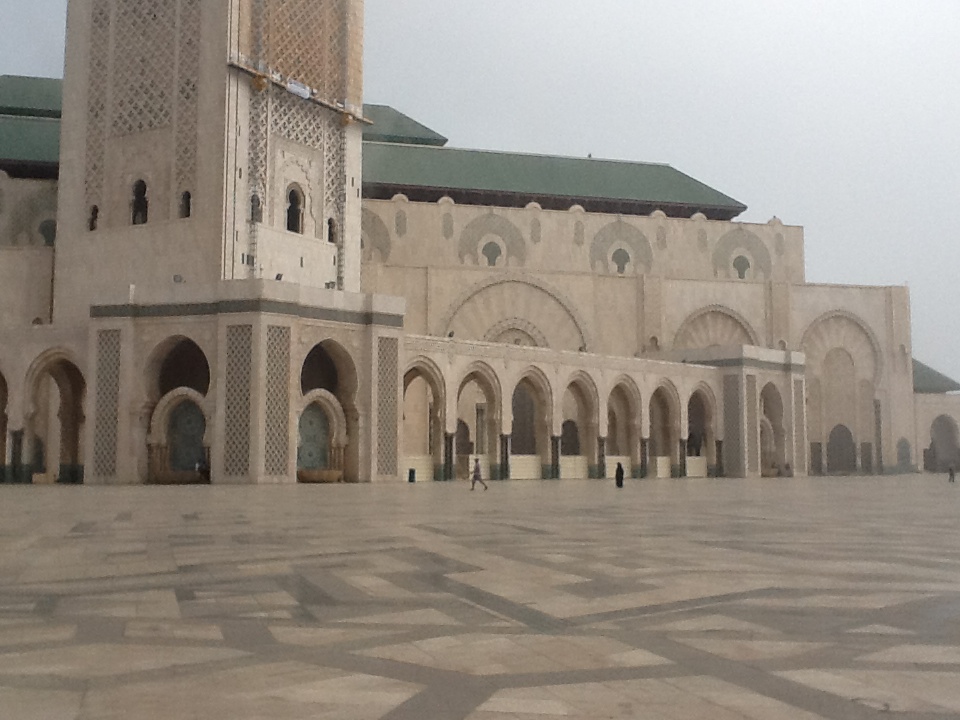 This is an outside view. It was so misty from the ocean (the mosque is right next to the Atlantic Ocean), the minaret was shrouded in fog. Inside, there was magnificent artistry of all kinds from tiling to woodworking. There was a purposeful intention in the design to draw on both cathedral-like elements (in the grandeur and high ceiling of the inner sanctum) as well as of the synagogue with a women’s balcony.