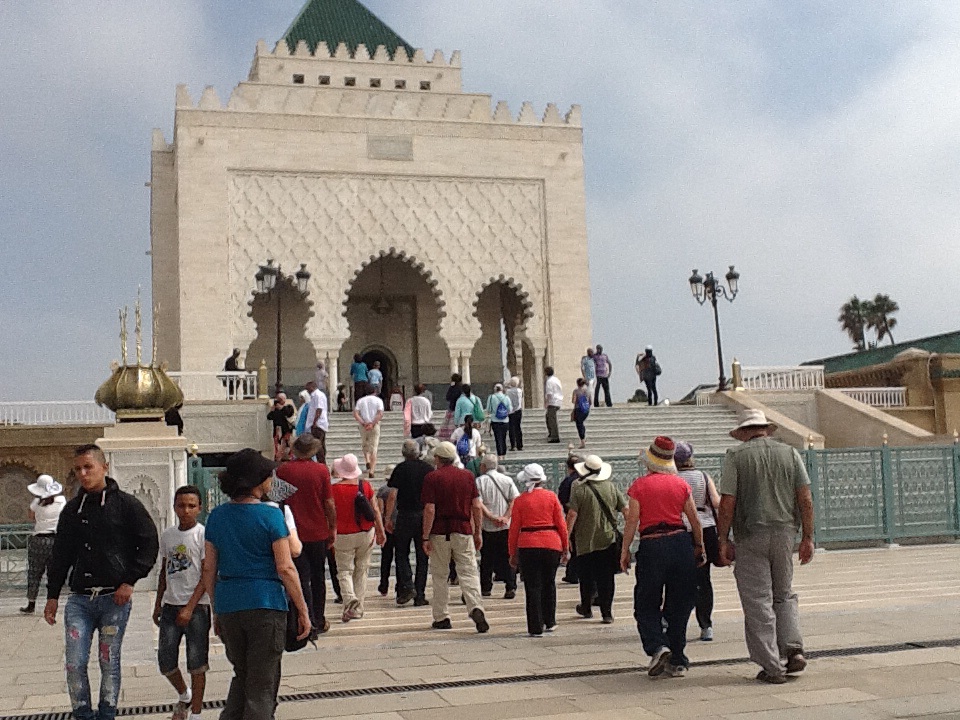 After a visit to the market in Meknes, where the spices and olives were gorgeously displayed, we left for Rabat to visit the mausoleum (considered an architectural gem) of King Mohammed V, the first king of independent Morocco, considered the father of the nation. He was put on the throne by the French in 1927, though he was not the legitimate heir to the throne, and served until 1953. He was exiled by the French from 1953-5 for not condemning the independence movement. His uncle was placed on the throne in his stead. Mohammed V was again recognized as sultan upon his return from exile, protested against the French protectorate, achieved independence from France in 1956, and ruled again as king from 1957 until his death in 1961. He was initially buried in the royal palace in Rabat, and was re-interred in this mausoleum when it was completed ten years later. While his tomb is in the center, in the back you will see the tombs of his two sons King Hassan II (who ruled from 1961-1999) and Prince Abdallah.
