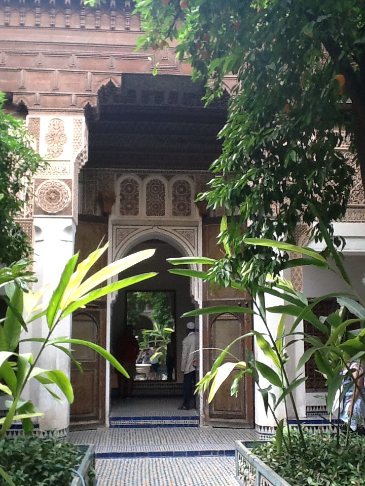 As part of our intensive introduction to Moroccan architecture, we learned to distinguish a riyad, a home with a central courtyard that is divided into four-squared gardens, and rooms off that courtyard. We visited the Bahia Palace (19th century), a classic example of a riyad.