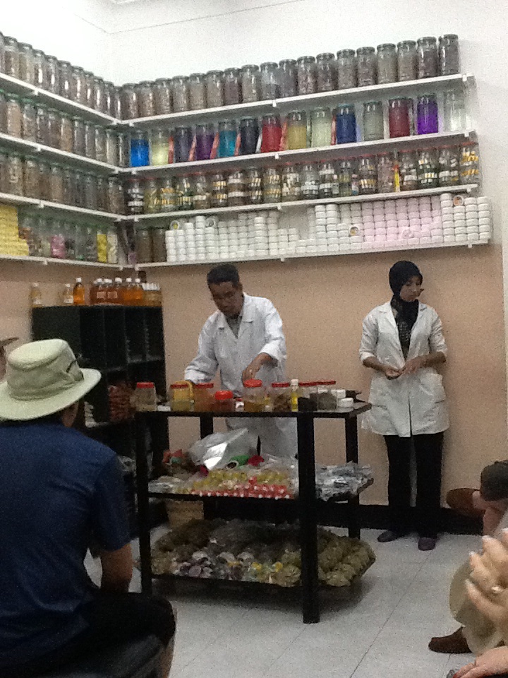 One of the highlights of our afternoon adventures in the souk/marketplace of the Medina was a visit to a Herboristerie or pharmacy. Unlike our American chain drugstores, these stores have shelves filled with jars of herbs and spices that get weighed out in grams. Some are cosmetic, some medicinal, and some for cooking. From “small doctor in the house,” small black seeds that one sniffs to alleviate headaches or respiratory issues (including snoring), to digestive herbs, to “Berber viagra,” to “magic lipstick,” to spices such as cumin or ginger, the pharmacy carries it all (but no Advil, Vicks, Jergen’s, etc.)
