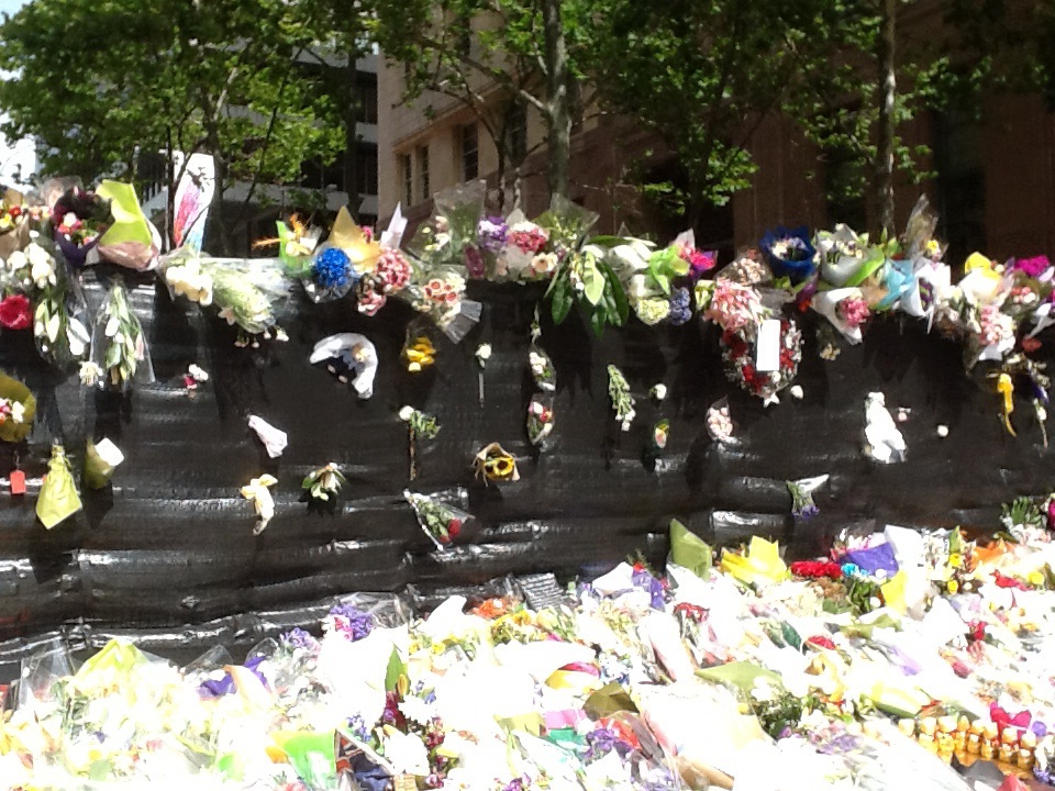 In my Sydney wanderings, I chanced upon the amazing flower memorial in front of the Lindt Cafe only days after that horrific hostage siege which left two innocent people dead along with the hostage-taker. From across the street, it looked like a flower market, and I went to admire the display, not even knowing until I was right in front, what it actually was. So many people came with flowers  to add to the memorial even while I was standing there.