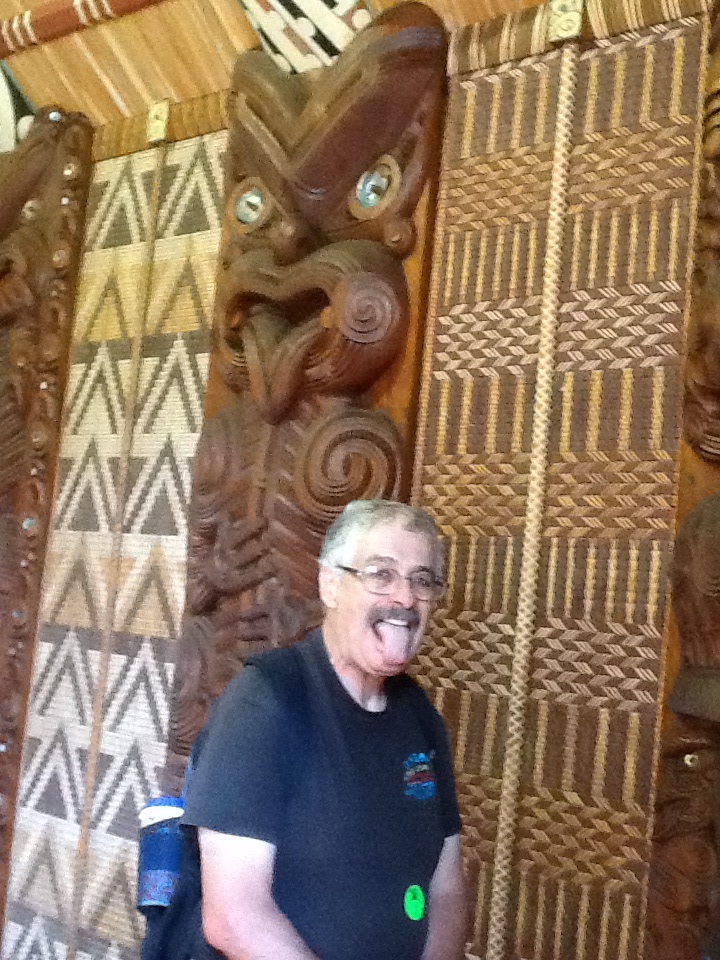 Wood carvings in the Marae (meetinghouse) feature the Maori ancestors. Those with their tongues out (as the carving and Chaim demonstrate in this photo)  indicate a warrior position, meaning “I am going to eat you!” The haka, a ceremonial war cry and dance, features this facial expression. The haka has become internationally known because the New Zealand rugby team (the “All-Blacks”) perform it before their games. (You may recall that the movie “Invictus” features an important game between the All-Blacks and S. Africa’s Springbok team.)