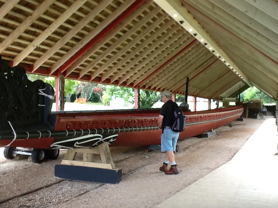 Waka at Treaty Grounds, approx. 120 feet long, largest in world. It is launched each year on the anniversary of the treaty signing, February 6. It requires 76 paddlers to maneuver it safely.