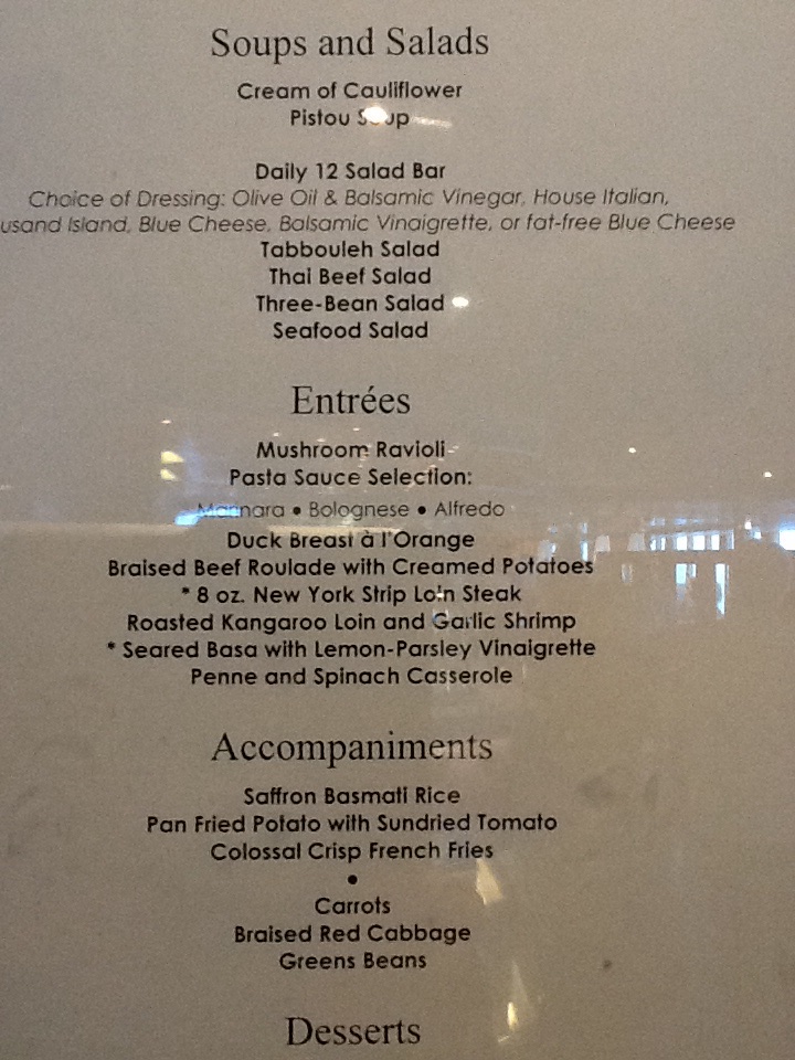 What follows is a menu from the ship on one of the first nights of the cruise. I was hesitant to post it earlier. I recommend that vegetarians and animal rights activists close this post now so you are not offended.