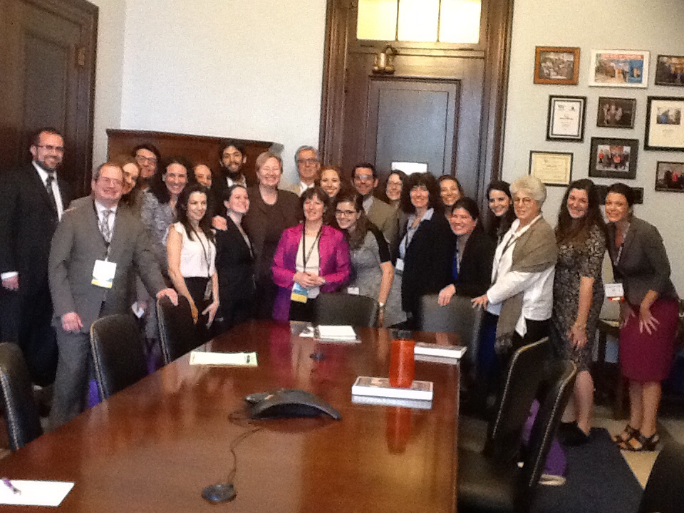 After the rallying cry from these congresspeople, we went off in our smaller groups to lobby, making 86 visits total yesterday on the Hill in both the Congress and the Senate! I went first with a small group from Westchester and the Bronx to lobby in Congresswoman Nita Lowey’s and Elliot Engel’s offices. Though the adults are all constituents of Congressman Engel’s district, the teens in our group were in Congresswoman Lowey’s district. And, I must say, the teens were AMAZING, speaking both about LGBT rights and the gay-straight alliance at their Jewish high school (Solomon Schechter of Westchester) and about the importance of education for girls and how they couldn’t imagine what it would mean to not have the opportunity to go to school.