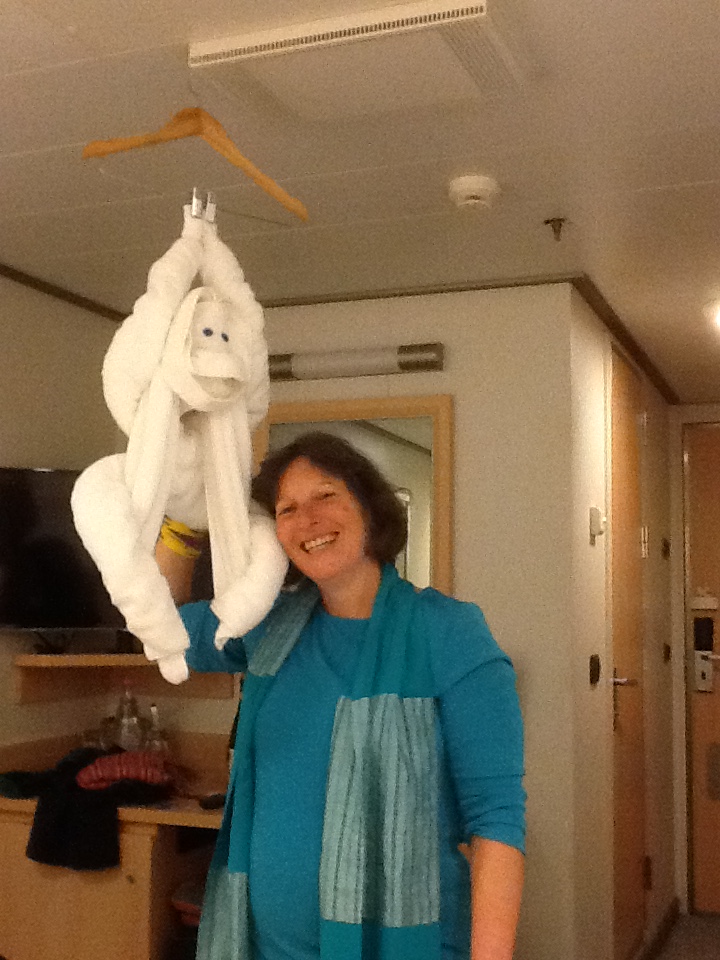 Our cabin steward, Joni, creates a different “towel” animal for our room each night. After Seder, we came back and were surprised by this cutie-pie monkey hanging from our ceiling!