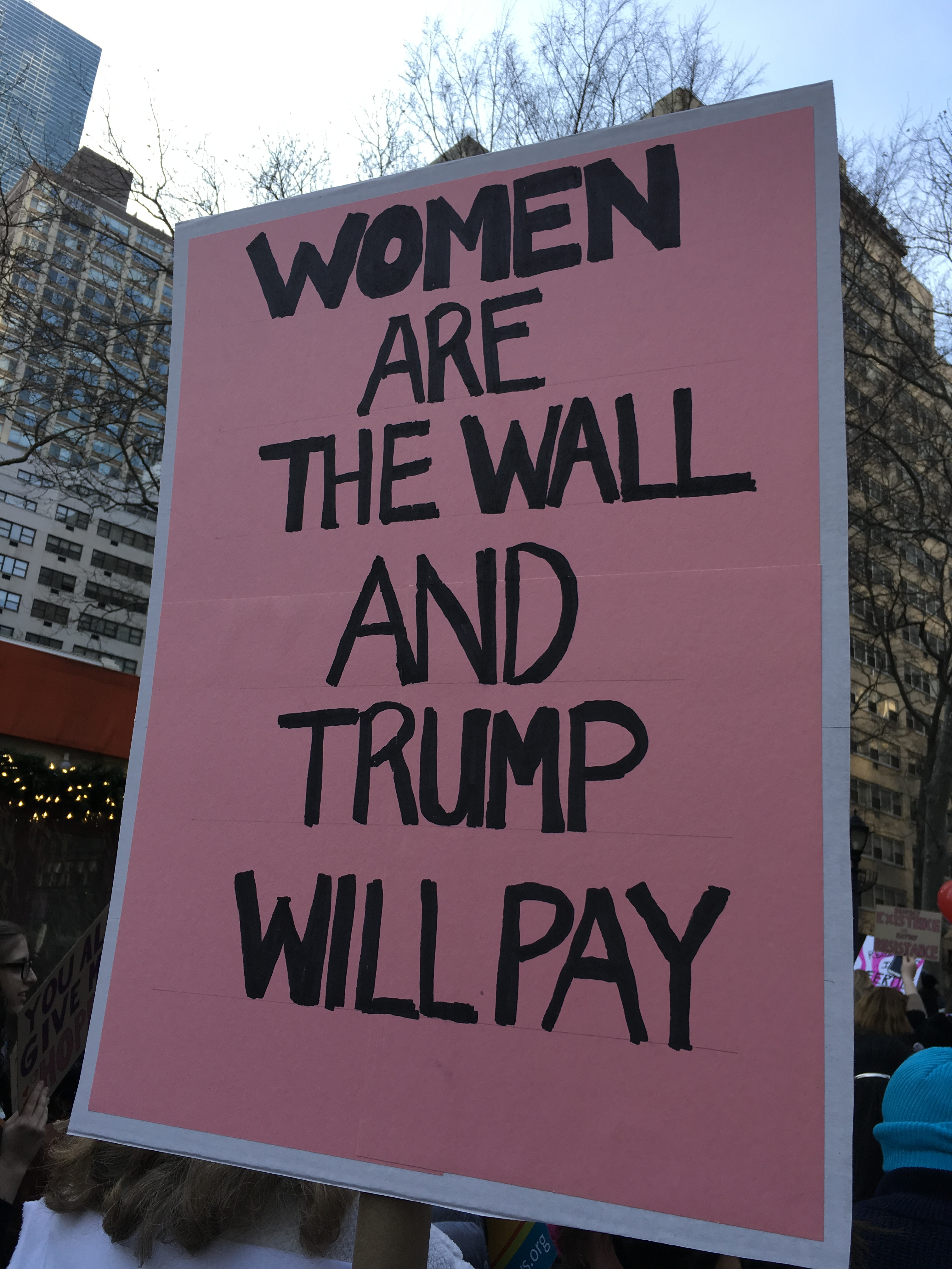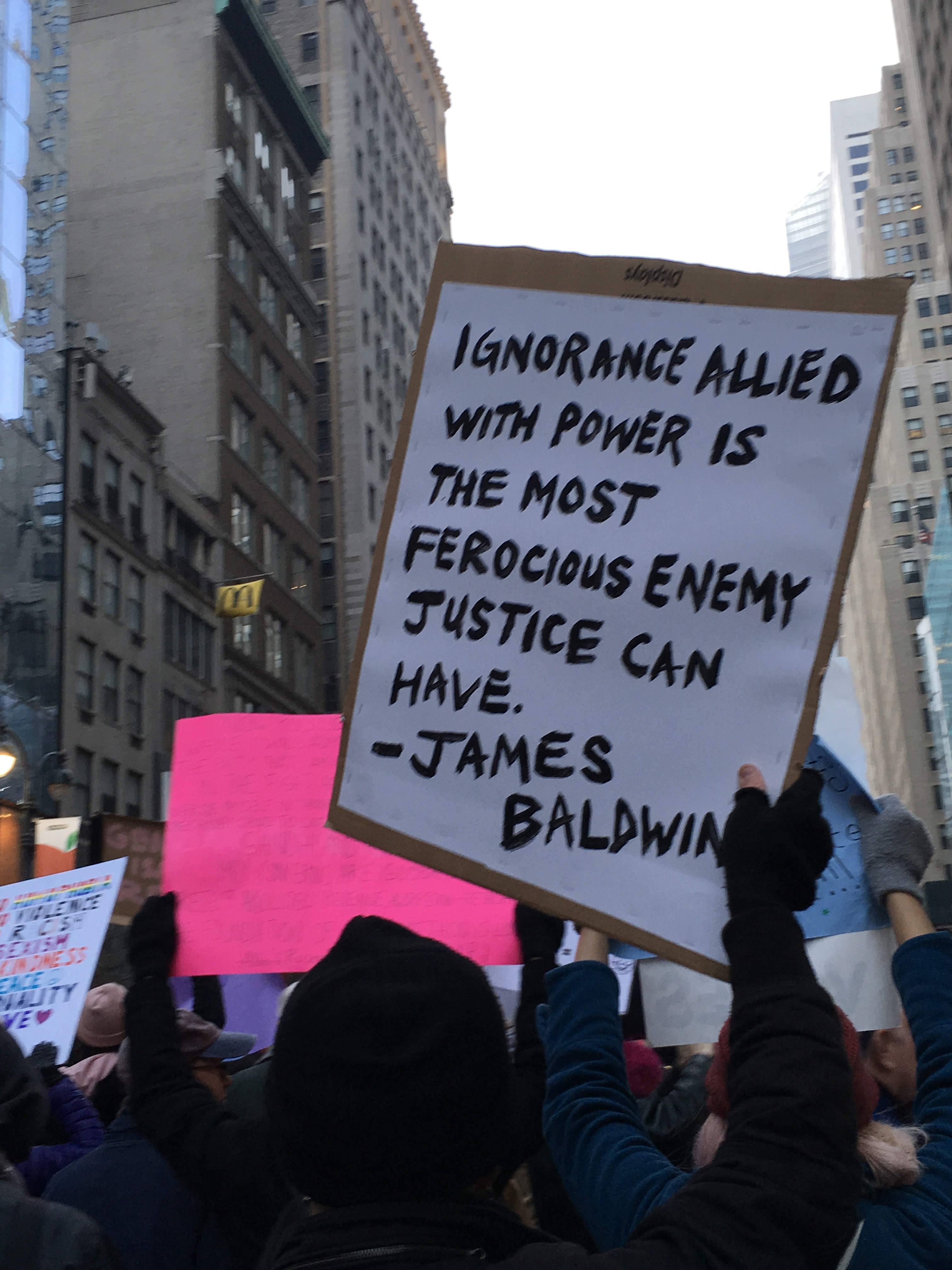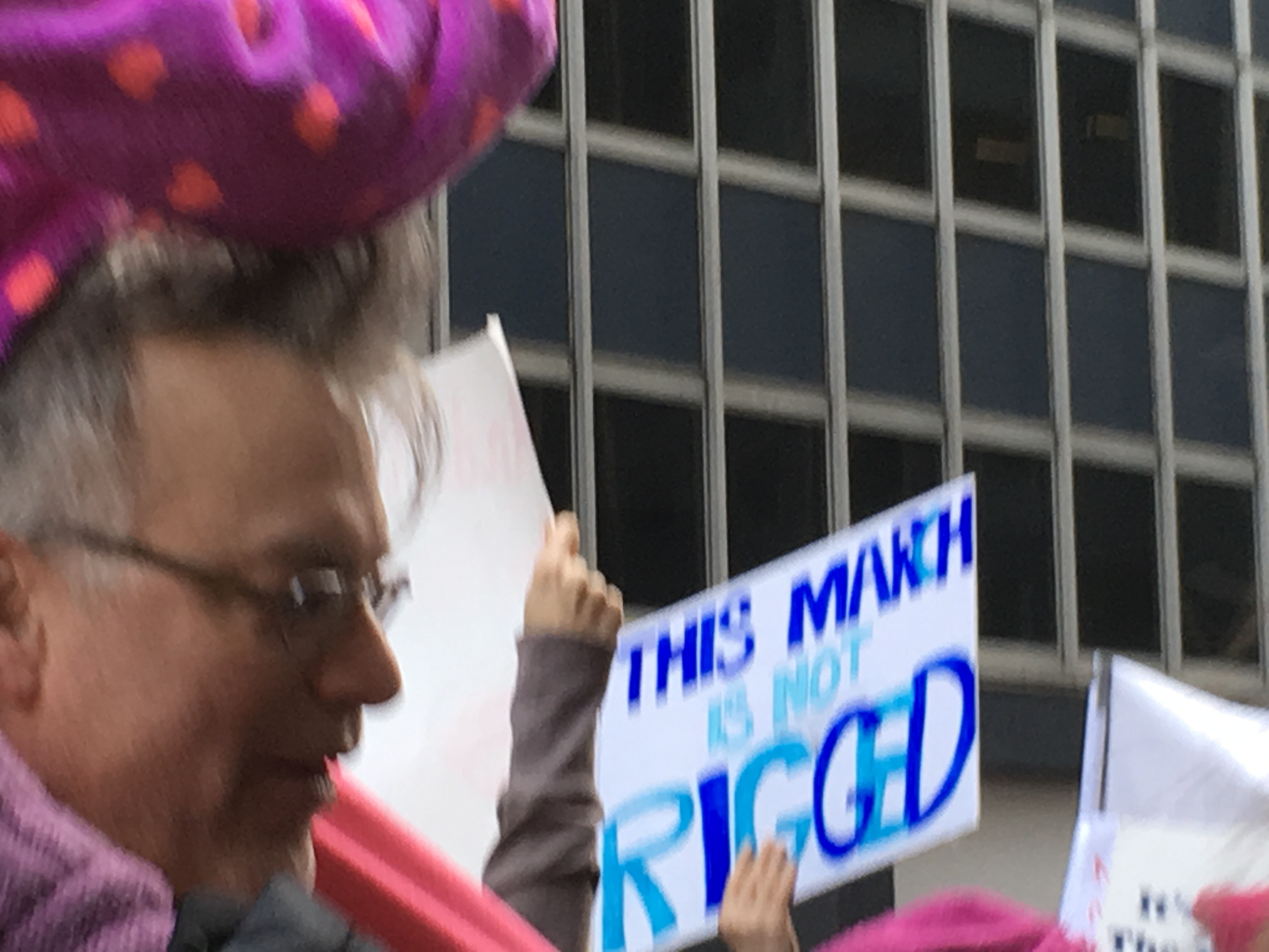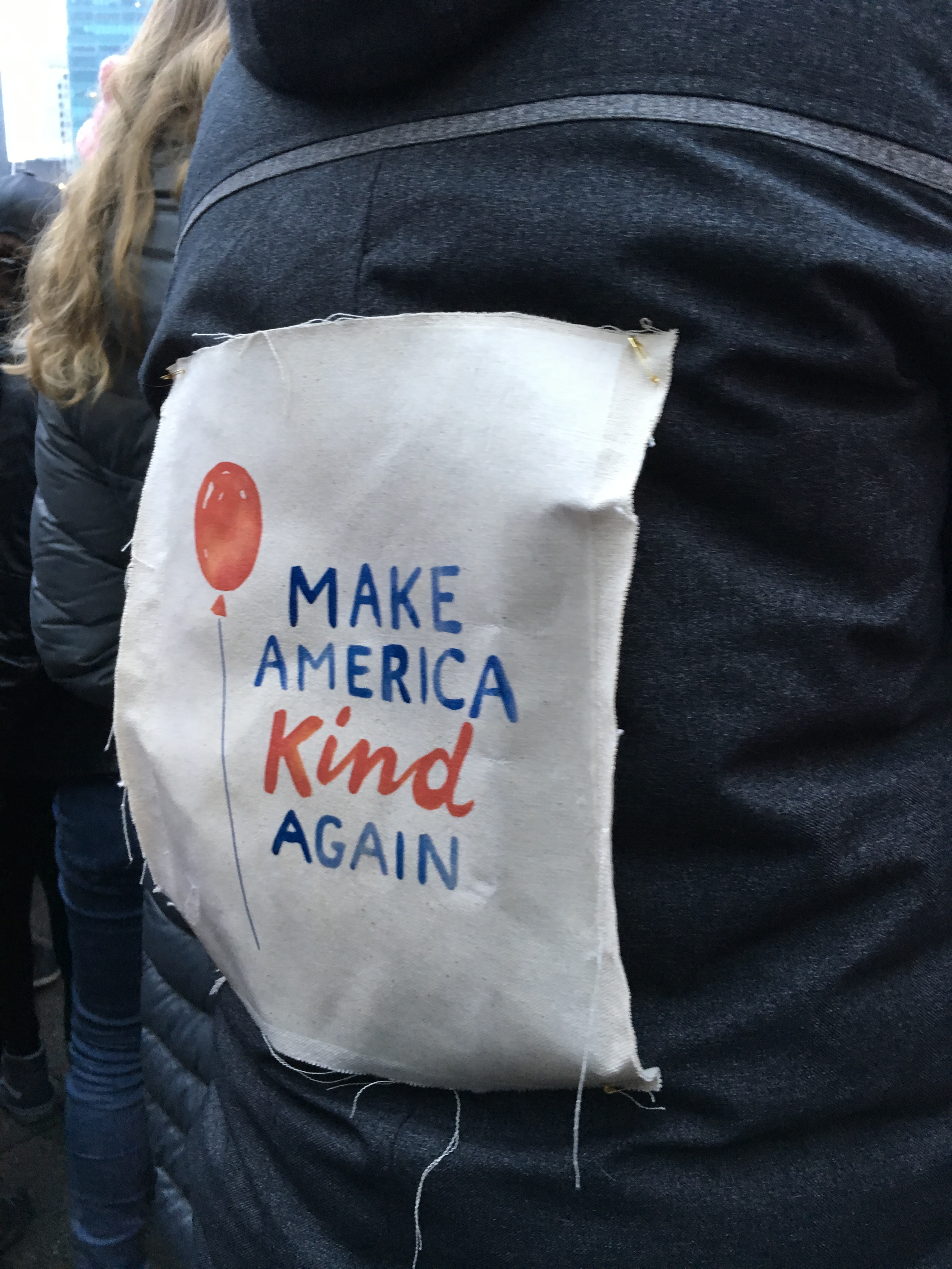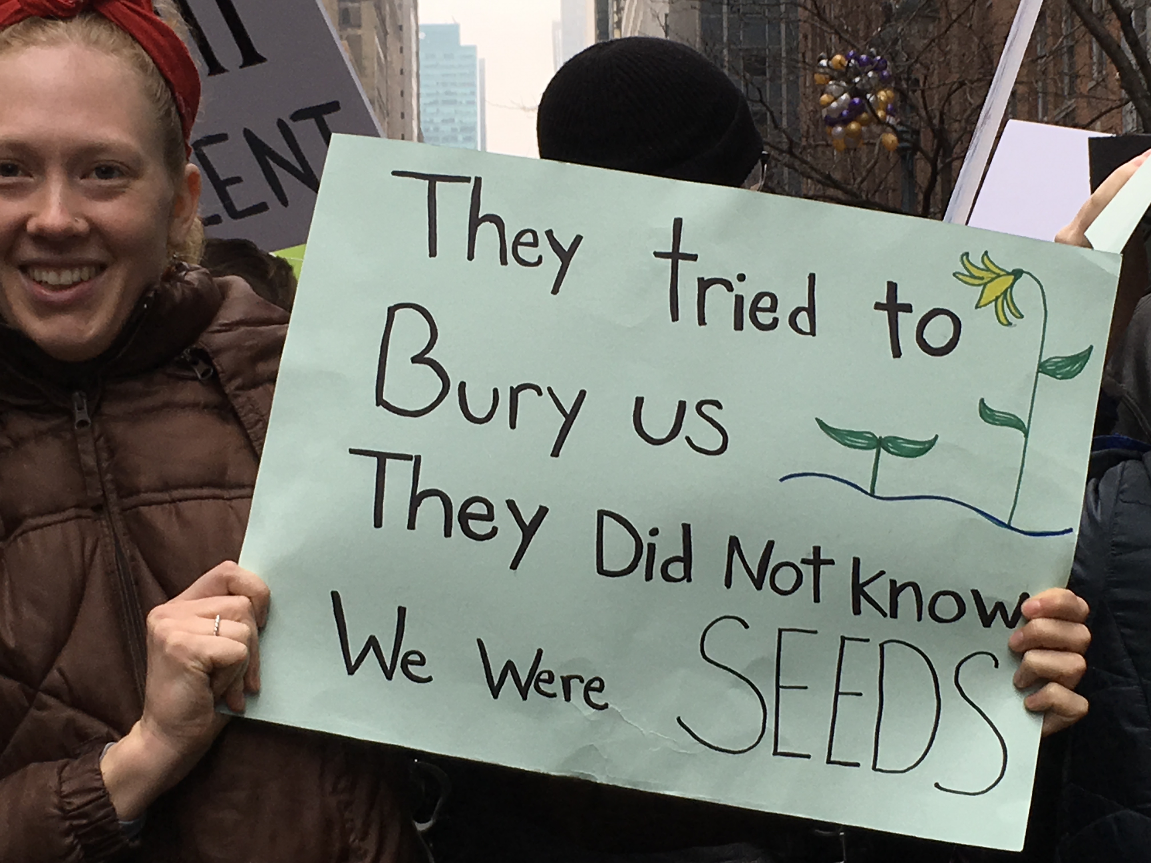 As we walked, the chants would come in waves, energize us for a time before fading out, replaced then by friendly chit-chat amongst the walkers who were thrust together in tight space. The crowd in NYC was 4x expectations (400,000 rather than the expected 100,000!), and the going was slow, inch by inch. And then another chant would rise, and we’d join in, and sing. Singing as protest is a time-honored and holy tradition.