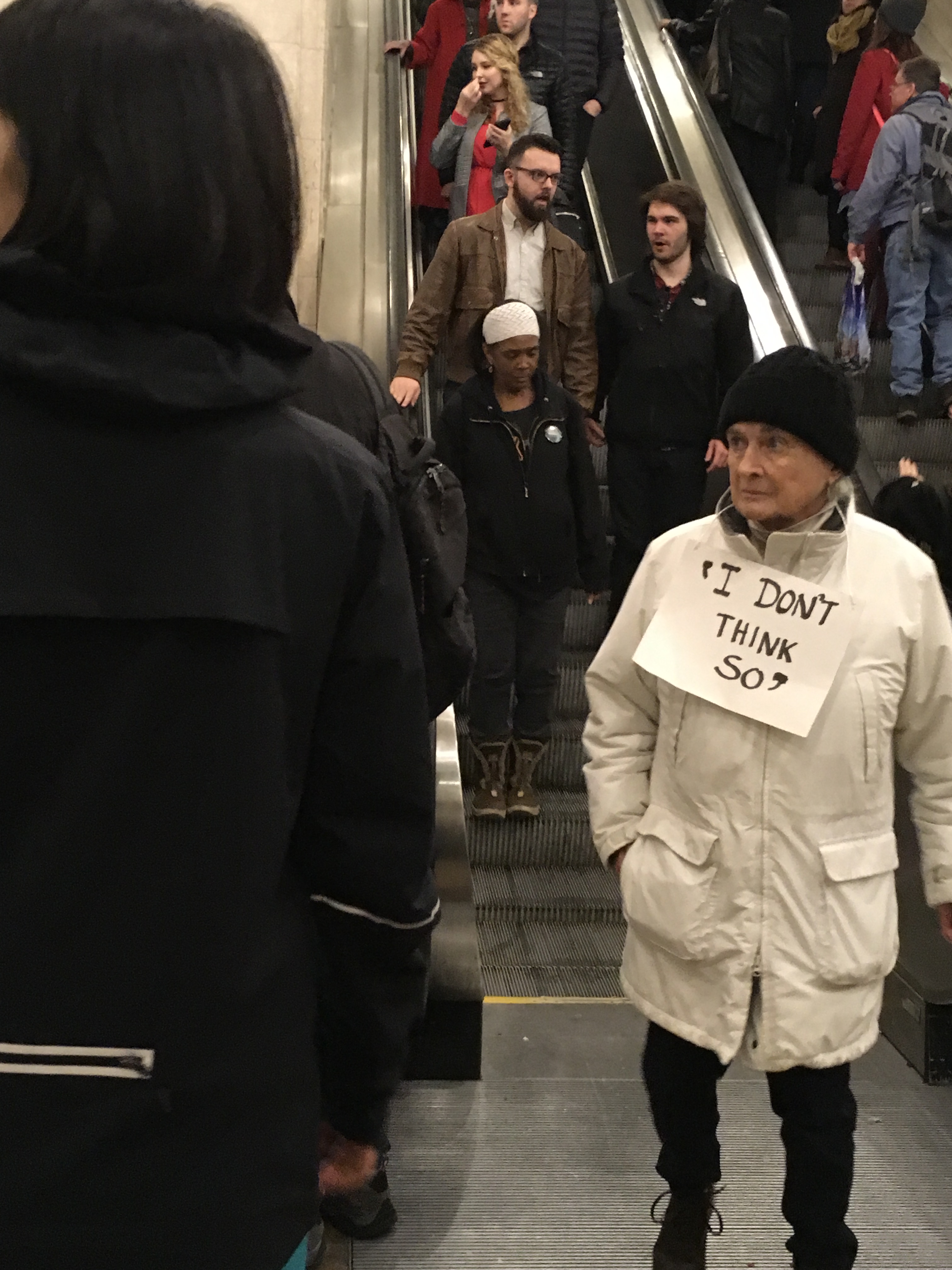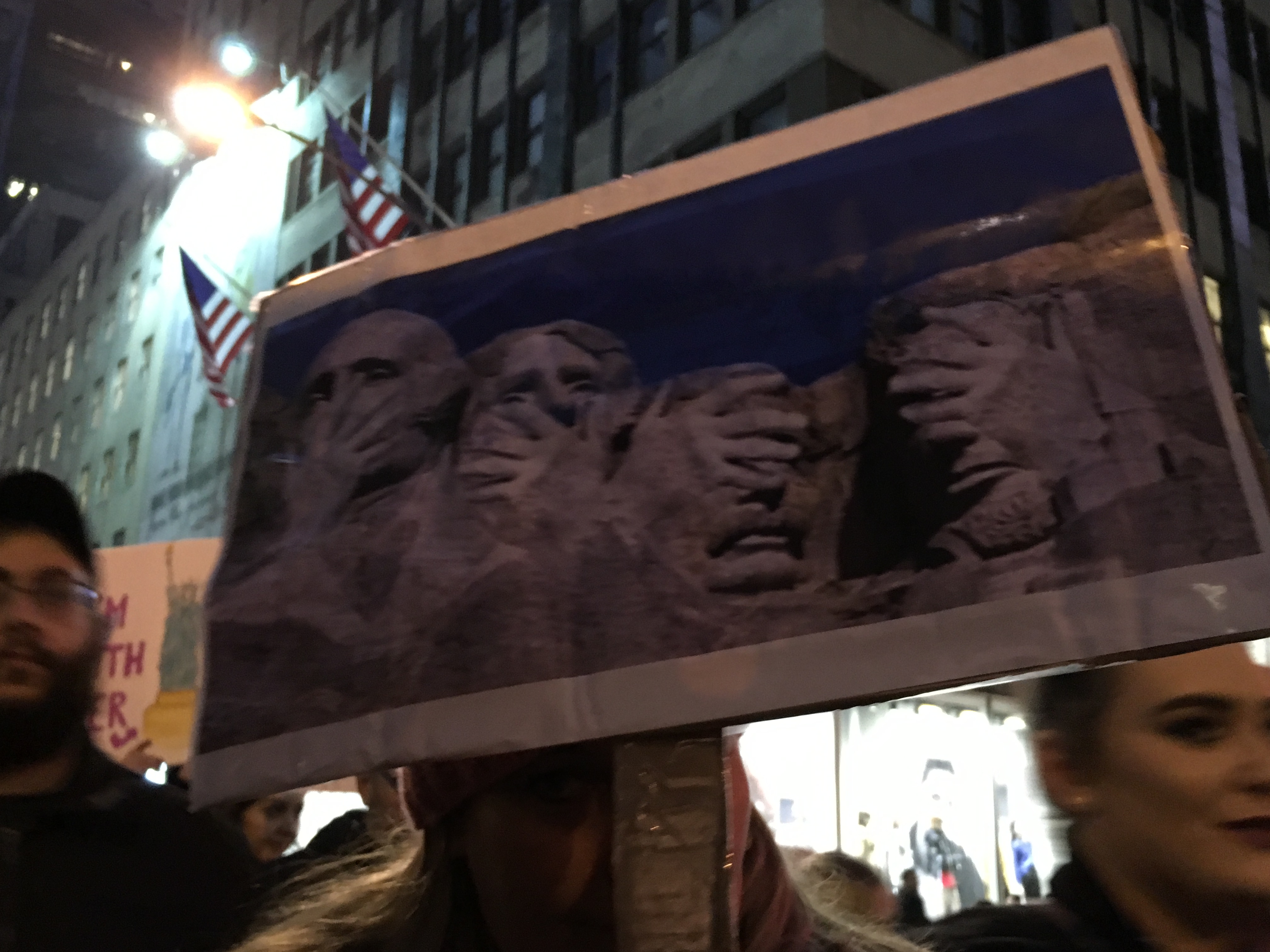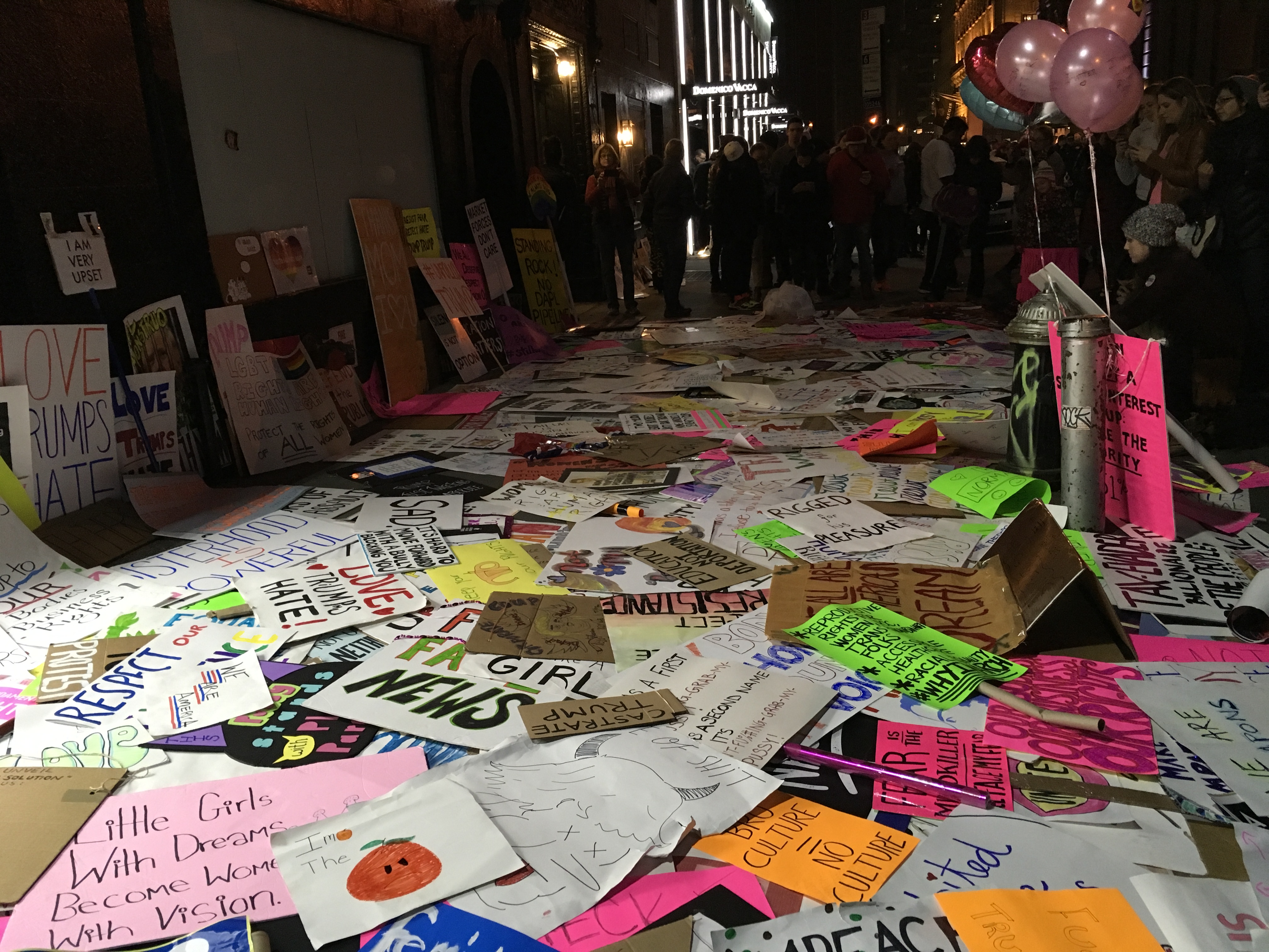 The crowds, as I said, were HUGE, and rolled on and on for hours, peacefully, and in good spirit. It took me 6 hours to walk a total of what I estimate to be 3-1/2 miles (about 35 city blocks). That’s terrible mileage! It was dark by the time I finished, and people left their signs behind along 55th Street, which was a great photo opportunity, too.