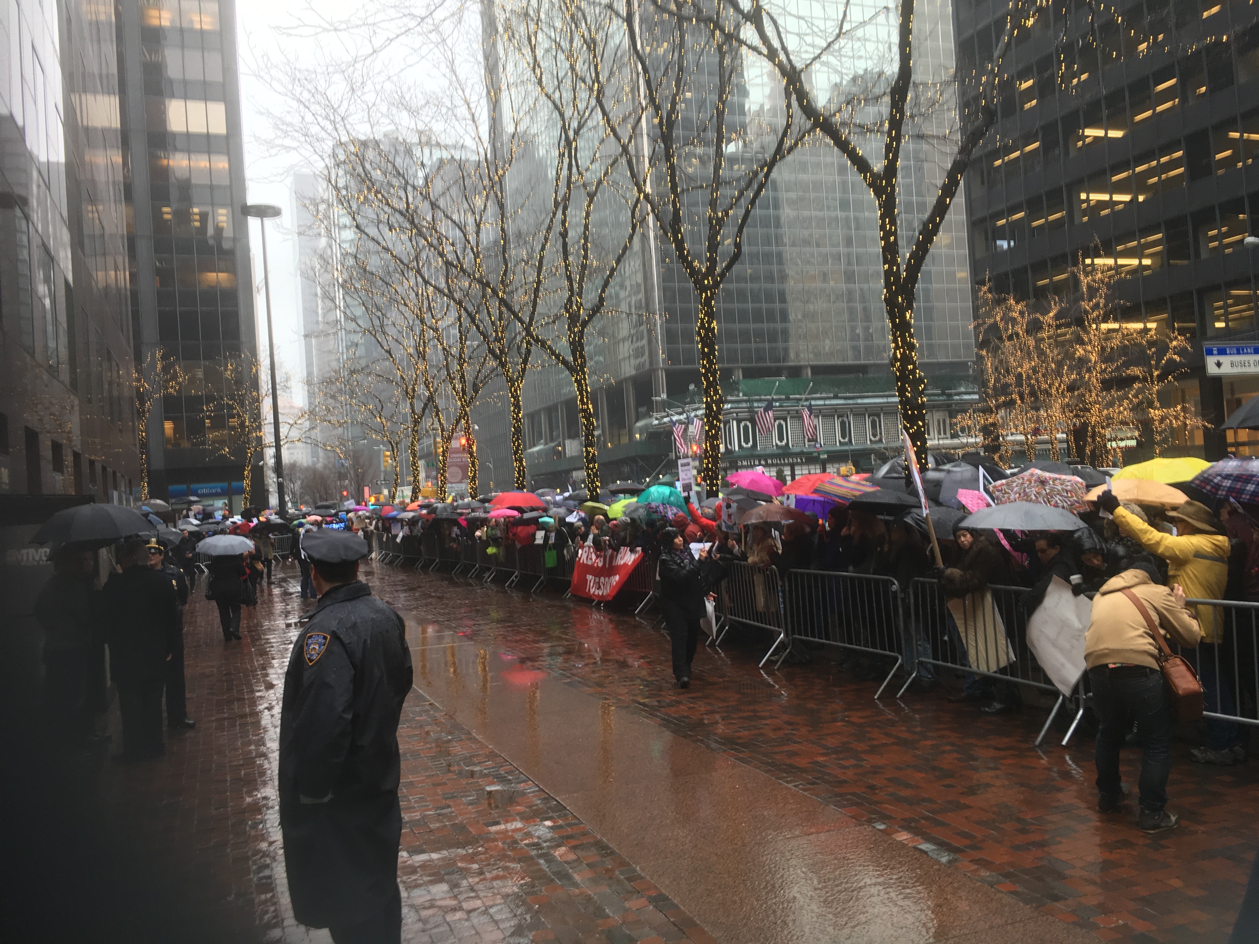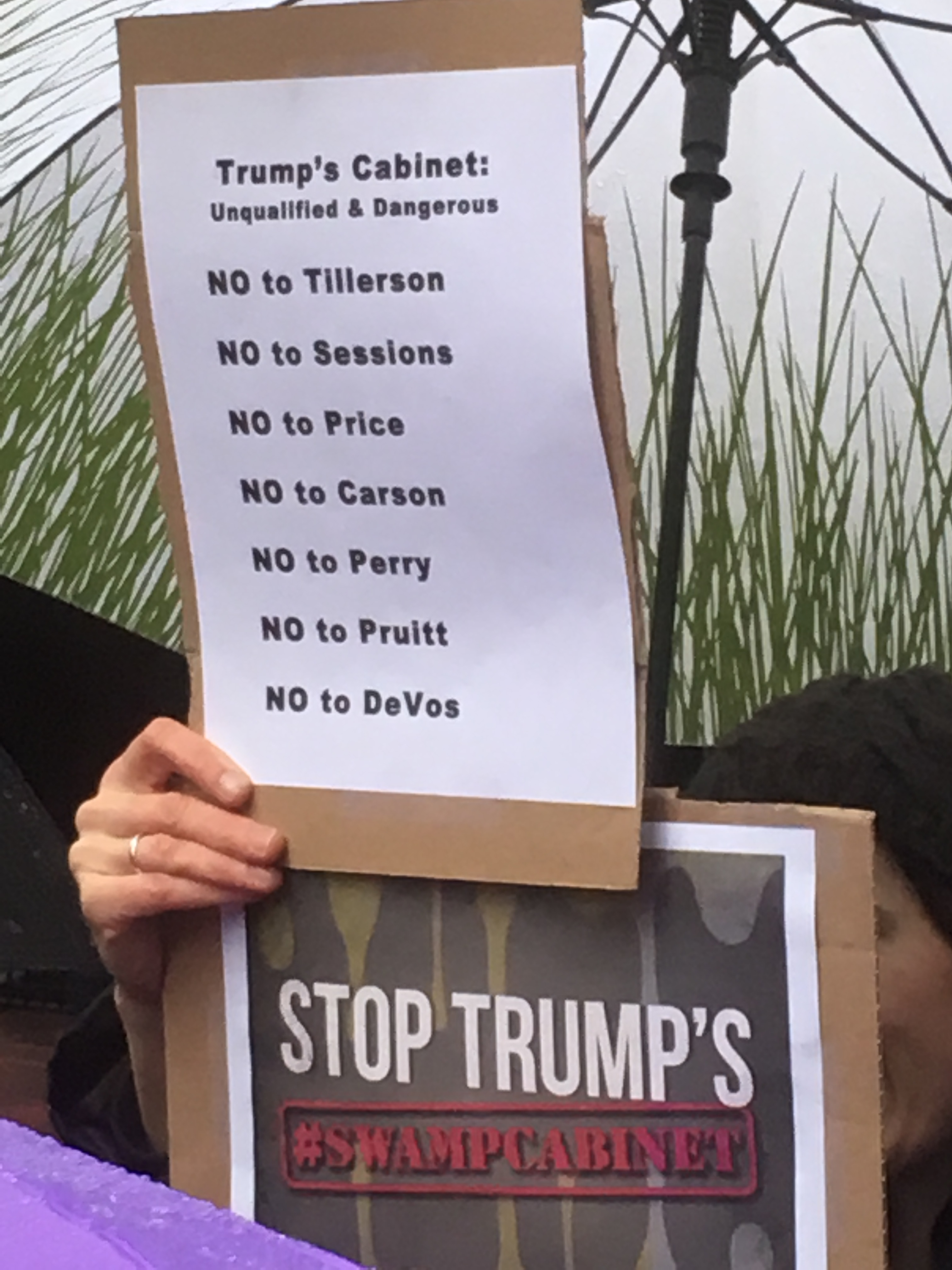 Today was the first of many “Resist Trump Tuesdays” to come, organized by MoveOn, Working Families, and People’s Action. At least two hundred actions took place all across the US today, with over 10,000 people showing up at their senators’ offices, whether Democrat or Republican, to “Stop the Swamp Cabinet.” Here in New York City, hundreds gathered in front of the offices of Senators Schumer and Gillibrand on Third Avenue IN THE POURING RAIN. We chanted all manner of energizing battle cries like “We’ll remember in November,” “Save our schools” (a direct reference to the appalling possibility of Betsy DeVos as Secretary of Education), and “Drain the swamp.” Doing actions like this are straight out of the Tea Party’s playbook. The Tea Party succeeded because of squeaky wheel disruptions whenever and wherever their elected representatives happened to be.