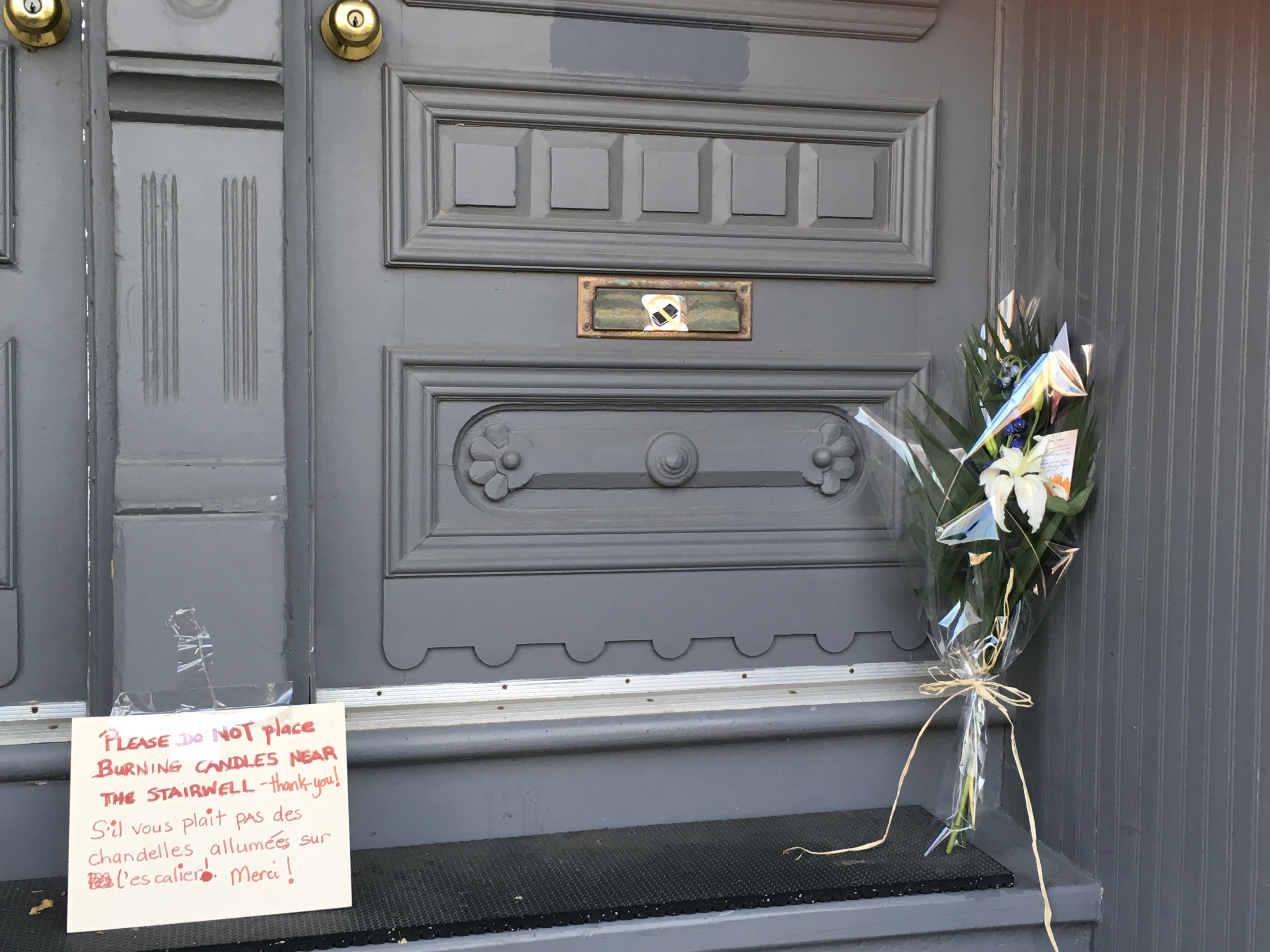 and (3) great vegan food at two other restaurants (all while staying within my allotted Weight Watcher points!), and paying homage to Leonard Cohen’s home, where flowers were left to honor his yahrzeit, in addition to a sign requesting that no burning candles be left.