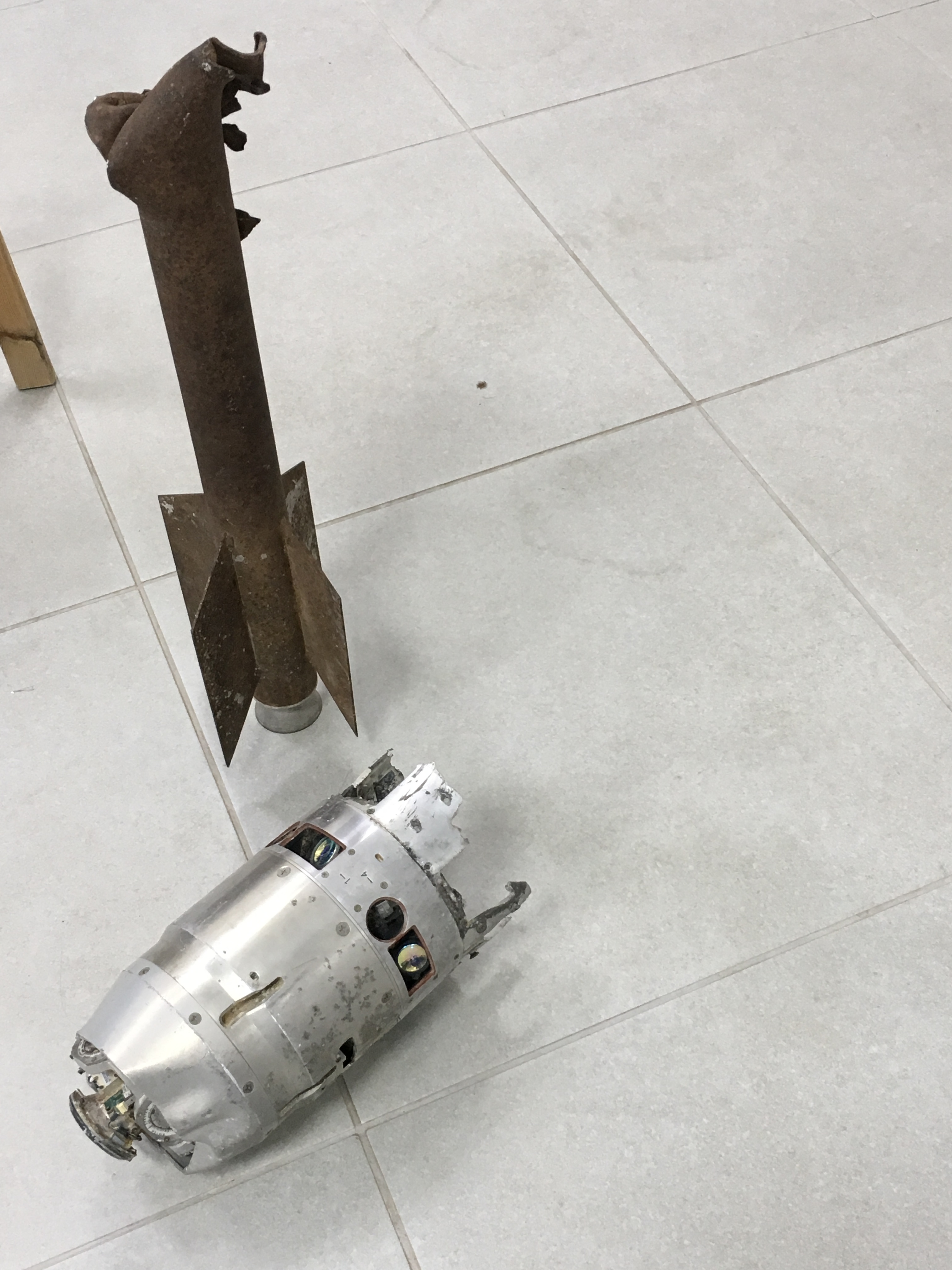 A home-made missile and the head of an Iron Dome that landed in Netiv Ha’asarah. The army tries not to use Iron Domes too close to the border for fear of them landing in Gaza and the Palestinians getting hold of sensitive technology.