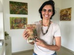 Keren posing in her home with her just-published book El haOlam Shelach/To Your World. Three of her paintings are on the walls behind her.