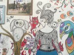 A wall containing pieces by multiple artists, including Bob Dylan’s song lyric transliterated into Hebrew: “Knock, knock, knocking on heaven’s doors” with devils, above which is a work by an artist who “contemporizes” classical pieces. In this one, the little girl is frustrated that she hasn’t received any Facebook messages.
