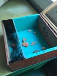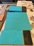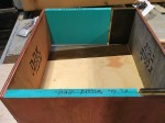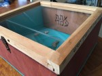 I started by painting/staining the bottom and two sides of the box. These sides contain a 1/4 inch slot into which plexiglass will later be placed. The blue represents water and the black continues the theme of the valley of the shadow of death. The outside is stained sienna on all four sides. Red was Howard’s favorite color.