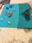 I collect heart-shaped stones that I pick up while hiking. I now finally had a use for them! I chose a reddish heart-shaped stone, glued it down on what would be the bottom of the box and covered it with black meshy material. This represents Howard in the valley. I also chose 9 other heart-shaped stones in different configurations (4 stones representing our family-of-origin sans Howard, 3 stones representing Howard’s nuclear family sans Howard, and 2 stones representing the larger community sans Howard*) and glued these stones to the floor board. In each case there is a missing “heart” that would complete the circle. Additionally, the 9 stones cannot constitute a quorum/minyan without that missing heart.