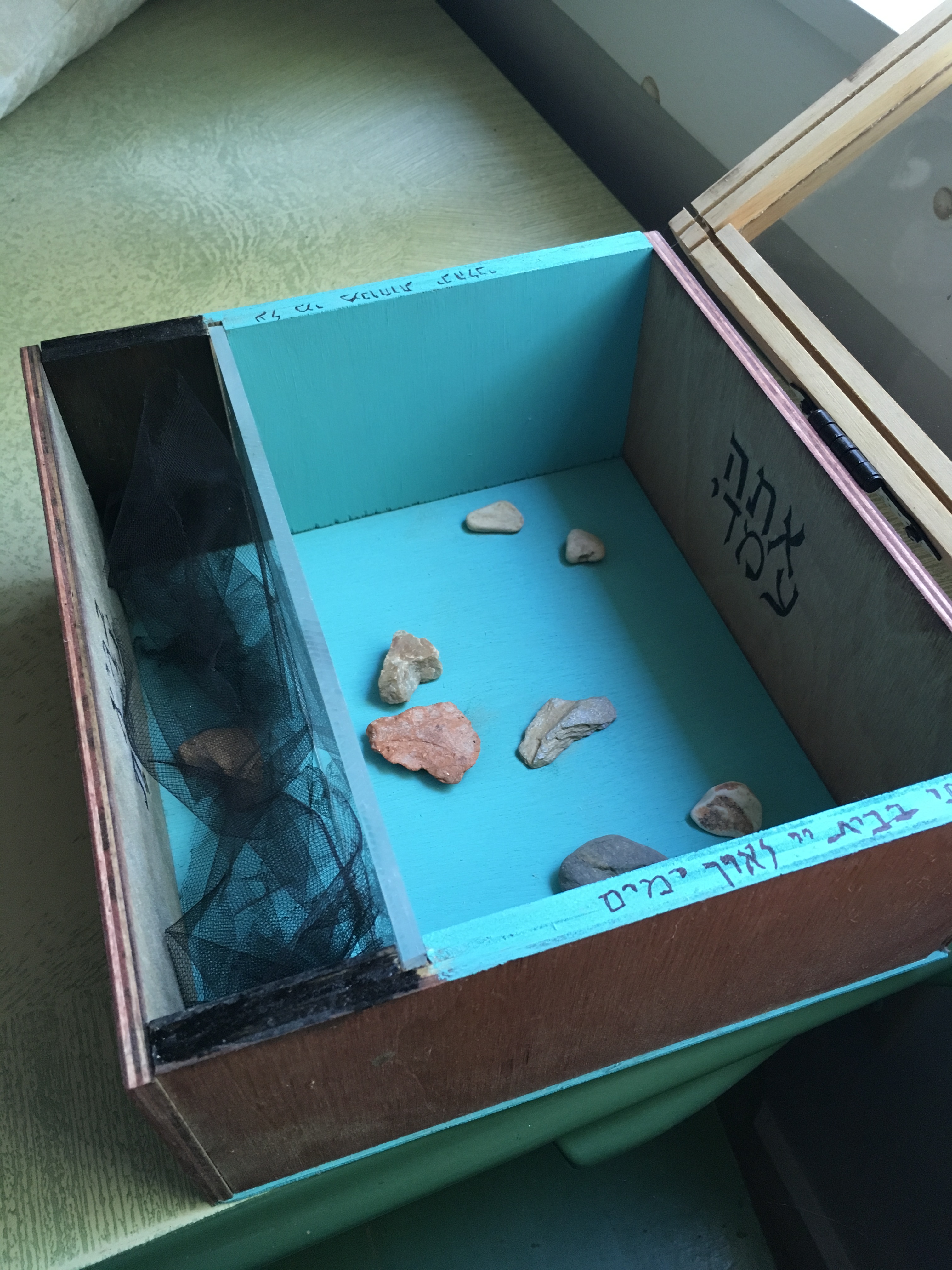 I collect heart-shaped stones that I pick up while hiking. I now finally had a use for them! I chose a reddish heart-shaped stone, glued it down on what would be the bottom of the box and covered it with black meshy material. This represents Howard in the valley. I also chose 9 other heart-shaped stones in different configurations (4 stones representing our family-of-origin sans Howard, 3 stones representing Howard’s nuclear family sans Howard, and 2 stones representing the larger community sans Howard*) and glued these stones to the floor board. In each case there is a missing “heart” that would complete the circle. Additionally, the 9 stones cannot constitute a quorum/minyan without that missing heart.