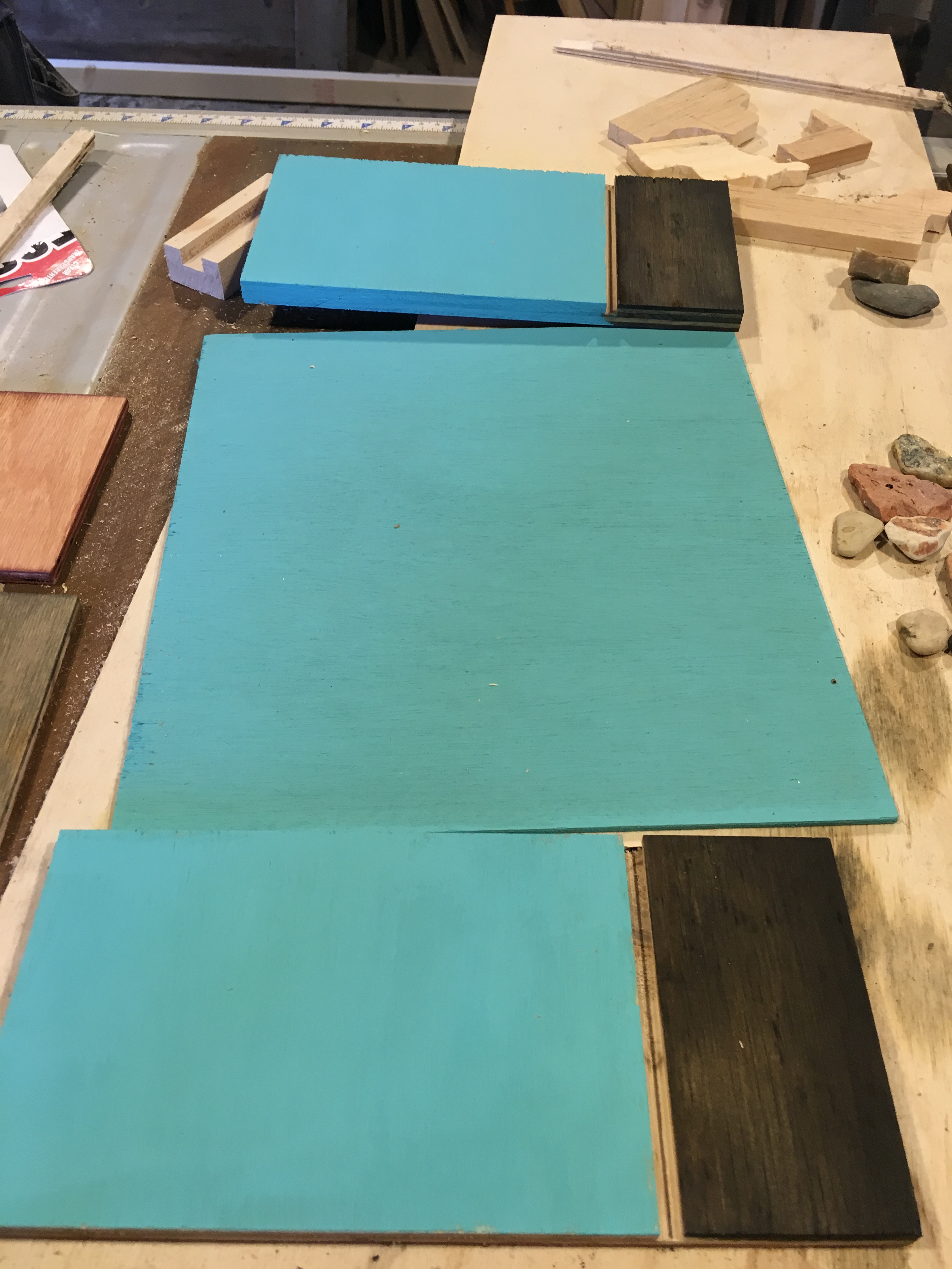 I started by painting/staining the bottom and two sides of the box. These sides contain a 1/4 inch slot into which plexiglass will later be placed. The blue represents water and the black continues the theme of the valley of the shadow of death. The outside is stained sienna on all four sides. Red was Howard’s favorite color.