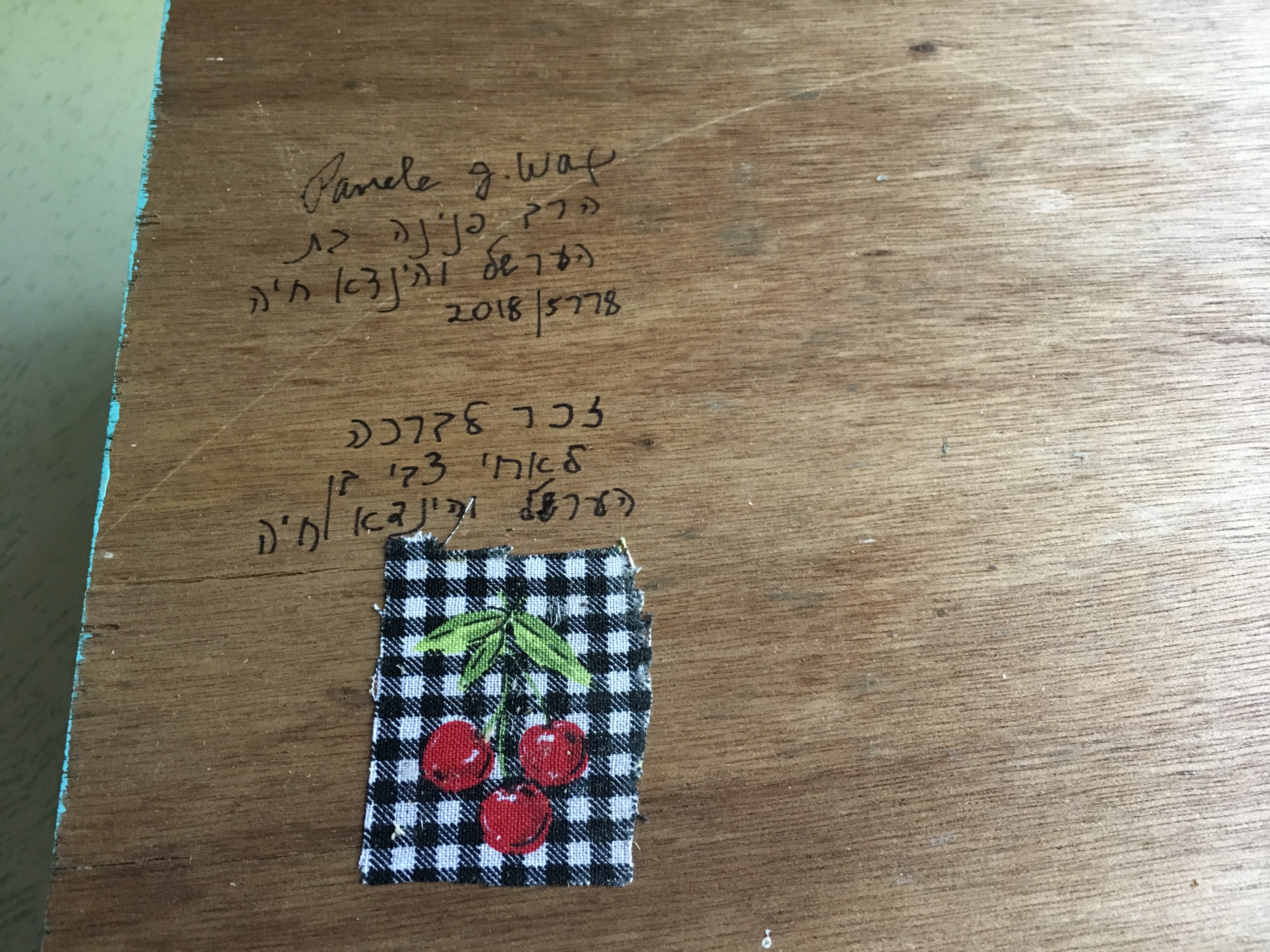 The bottom of the box has my signature in Hebrew and English, and is dedicated to my brother. I also glued a piece of cloth depicting 3 cherries, as our grandfather referred to my sister, brother and me as his 3 perfect cherries.