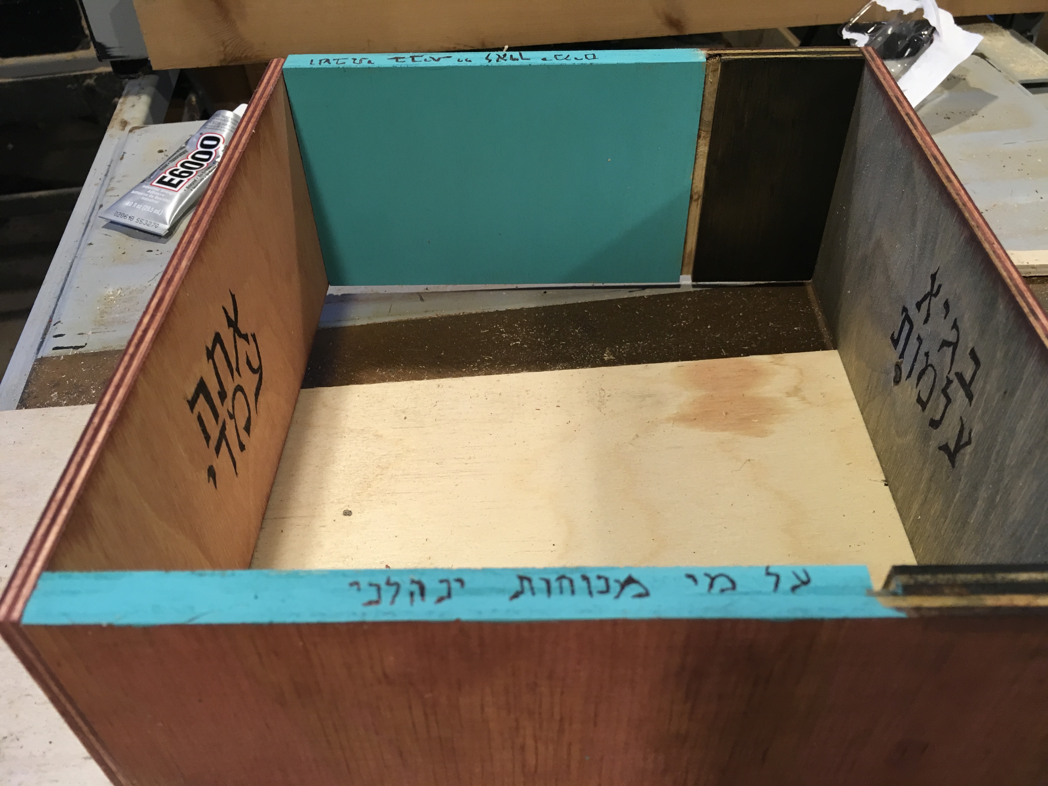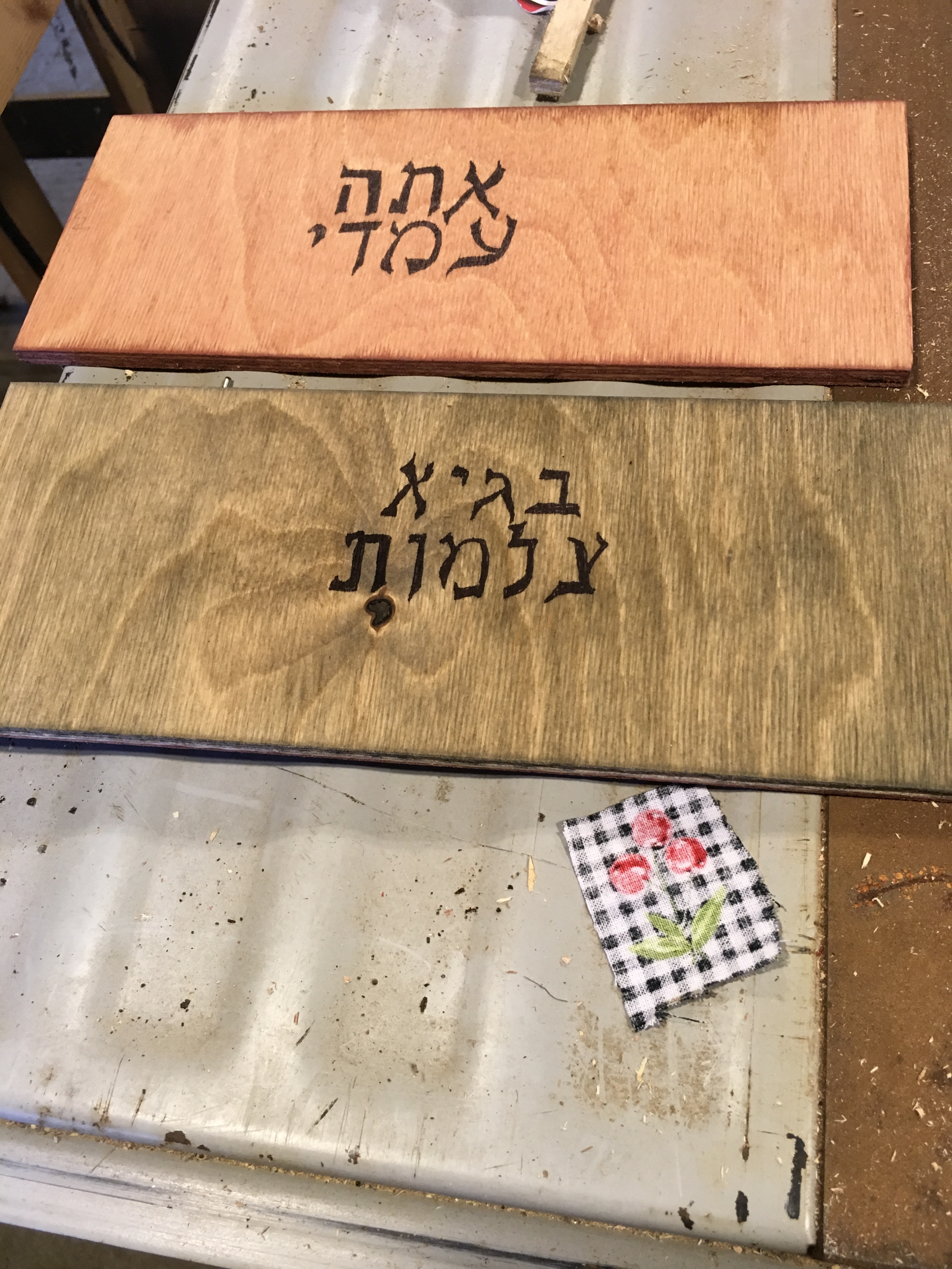 Then I stained the two other sides both inside and out and wrote a different phrase from Psalm 23 on each. One says b’gei tzalmavet (in the valley of the shadow of death) and the other says Ata imadi (You are with me).